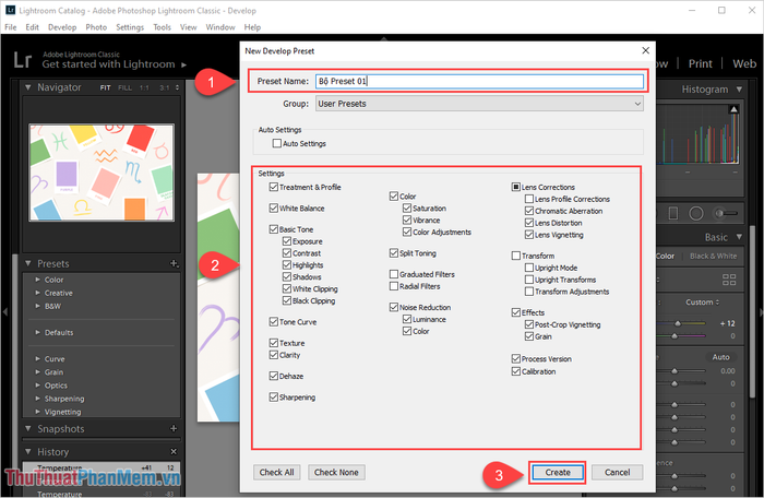 Bước 3: Sẽ mở cửa sổ New Develop Preset và bạn cần nhập nhiều thông tin khác nhau bao gồm: