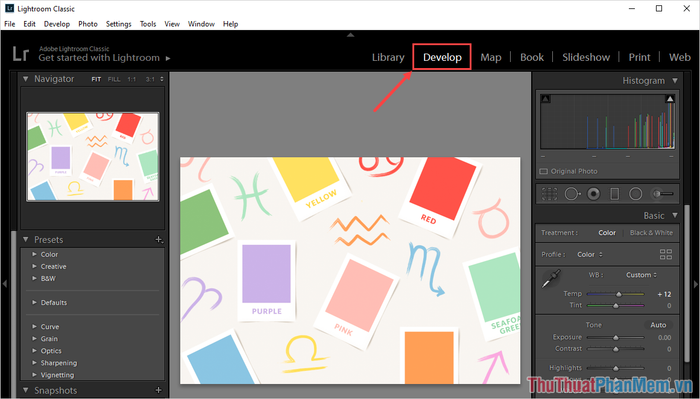 Bước 1: Trong giao diện chính của Lightroom, bạn chọn Develop (Phát triển).