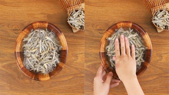 Sau khi mua cá cơm khô, đặt vào tô và đổ nước ngập cá. Sử dụng tay nhẹ nhàng để ngâm cá trong nước trong 15 phút, làm cho cá mềm. Sau đó, dùng rây để vớt cá ra và để ráo.