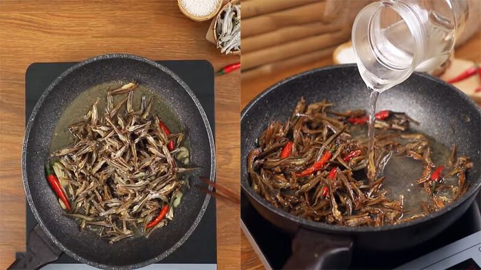 Sau đó, thêm cá cơm chiên vào chảo với 3 muỗng canh nước lọc, đảo đều và rim trong 5-7 phút, đến khi nước cạn hết thì tắt bếp.