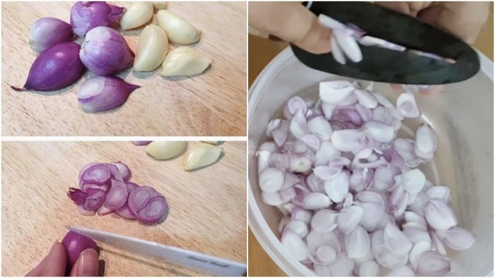 Lột vỏ hành tím và tỏi, rửa sạch và cắt lát mỏng