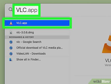 Bật ứng dụng bằng cách nhập 'vlc' vào Spotlight.VLCMở- Bạn cũng có thể nhấp vào ứng dụng VLC trong Launchpad hoặc nhấp đúp vào biểu tượng VLC trong thư mục Applications (Ứng dụng) để mở.