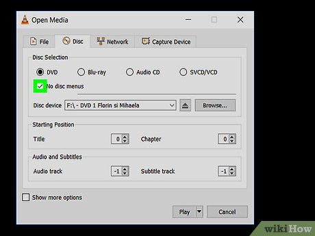 Đánh dấu vào ô 'Không có trình đơn đĩa' (No disc menus). Đây là tùy chọn trong phần 'Chọn đĩa' của cửa sổ 'Mở Nội dung nghe nhìn'.