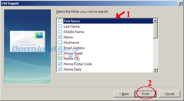 Bước 4: Trong cửa sổ này, bạn có thể chọn các trường muốn lưu trữ, sau đó nhấp chuột vào Finish để hoàn tất quá trình sao lưu danh bạ.