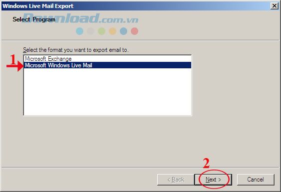 Bước 2: Một cửa sổ mới sẽ hiện ra để bạn chọn chương trình sao lưu. Ở phần Select the format you want to export email to, chọn Microsoft Windows Live Mail. Sau đó nhấn Next để tiếp tục.