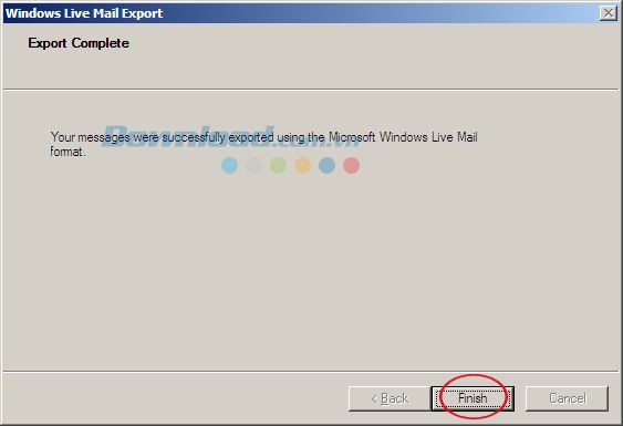 Bước 5: Quá trình sao lưu có thể diễn ra nhanh hoặc chậm tùy thuộc vào số lượng email. Khi quá trình sao lưu trên Windows Live Mail hoàn tất, nhấn chuột vào Finish để kết thúc.