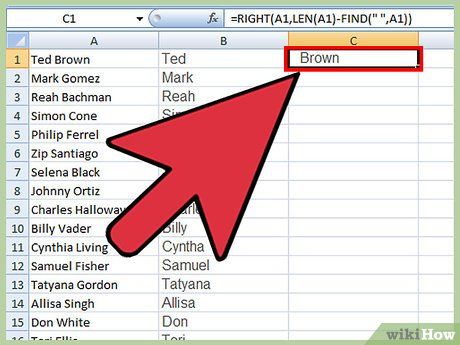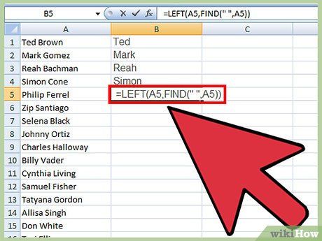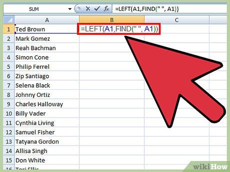 Nhập công thức cho phần tên. Điền công thức này vào ô đầu tiên của cột mới: =LEFT(A1,FIND(' ',A1)) và đảm bảo có khoảng trắng trong dấu ngoặc kép. Công thức này sao chép tất cả dữ liệu trước khoảng trắng trong cột tên đầy đủ.
