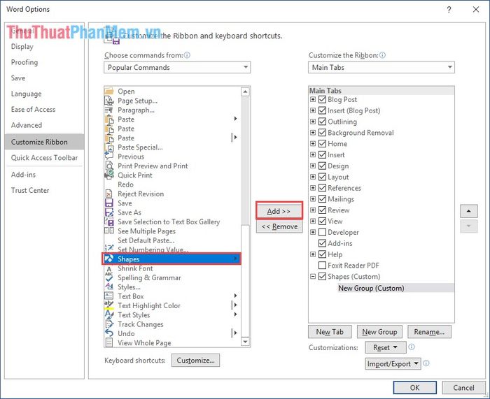Bước 4: Sau khi đã tạo xong, bạn tìm đến mục Shapes ở cột bên phải và nhấn Add để thêm vào thanh công cụ vừa mới tạo.