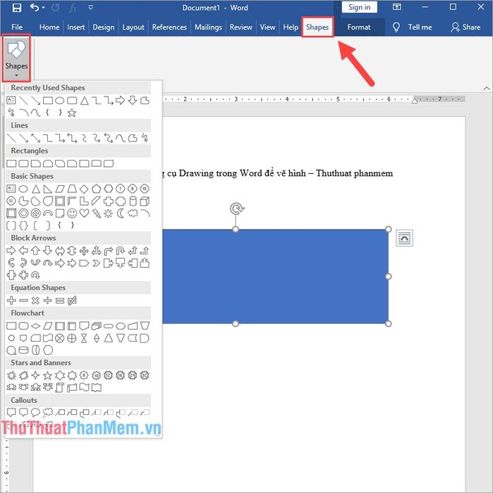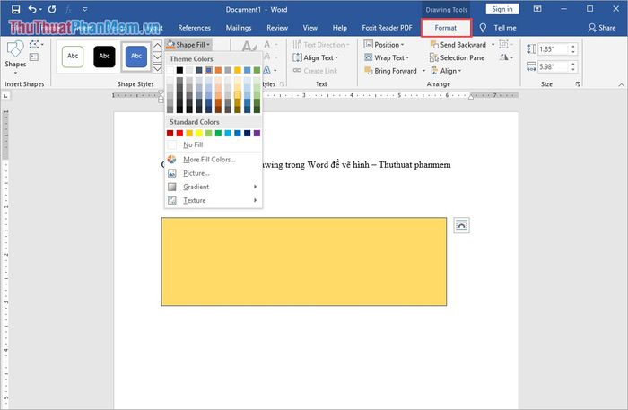Bước 2: Sau khi đã chọn hình và vẽ xong, bạn có thể chọn thẻ Format để thay đổi màu sắc hoặc thuộc tính của hình vẽ.