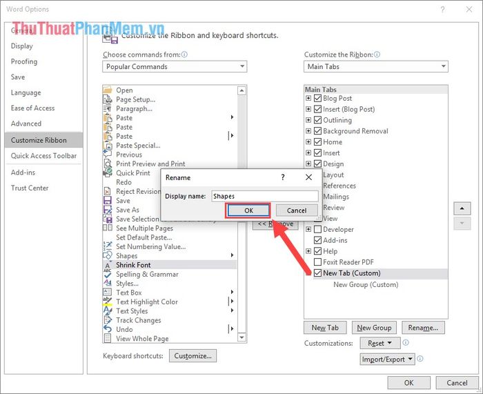 Bước 3: Tiến hành đặt tên cho thanh công cụ, bạn có thể đặt là Shapes, vẽ hình, Drawing tùy ý sao cho dễ nhớ!