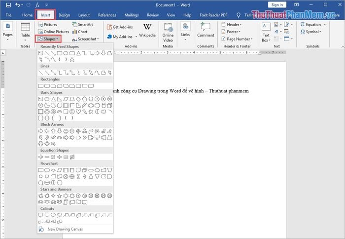 Bước 1: Chọn thẻ Insert và chọn Shapes. Công cụ Drawing sẽ hiển thị để bạn có thể vẽ các hình sẵn có.