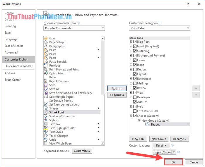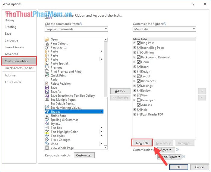 Bước 2: Tiếp theo, chọn thẻ Customize Ribbon và nhấn vào New Tab để tạo thẻ công cụ mới trên phần mềm.