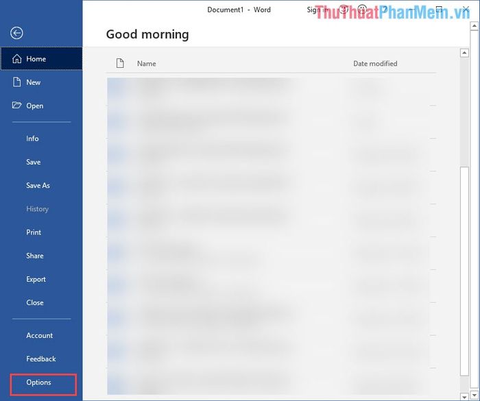 Bước 1: Mở File và chọn Options để cấu hình Word.