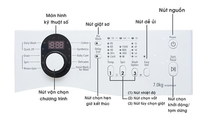 Các phím điều khiển quan trọng trên bảng điều khiển máy giặt Samsung cửa trên: