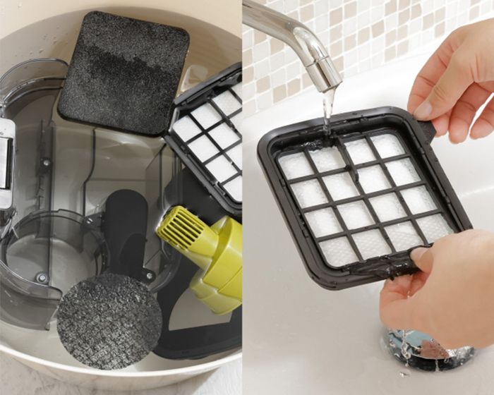 Bước 1: Tháo hộp chứa bụi ra khỏi máy và rửa sạch với nước. Phơi khô rồi lắp lại vào máy.