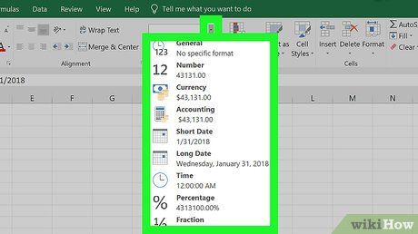 Định dạng văn bản nếu cần. Nếu muốn thay đổi định dạng của một ô (ví dụ: đổi từ tiền tệ sang ngày), hãy nhấp vào thẻ Home, chọn loại định dạng tại phần 'Number' (Số).