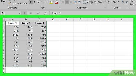 Chọn dữ liệu. Kéo chuột từ ô trên cùng, bên trái xuống ô dưới cùng, bên phải của khối dữ liệu.