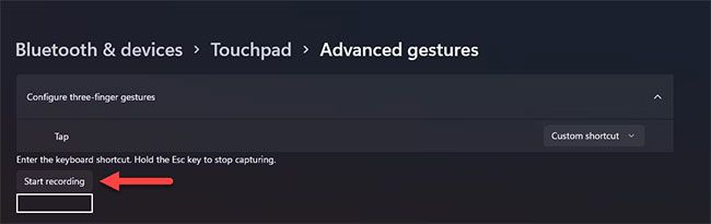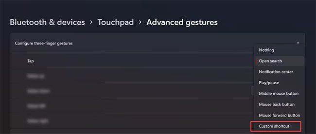 Bước 3: Trong menu Configure three gesture, bạn có thể chọn các cử chỉ muốn tùy chỉnh. Ví dụ, bạn có thể thay đổi hành động Tap bằng cách chọn Custom shortcut để liên kết với các thao tác chuột hoặc phím tắt của Windows.