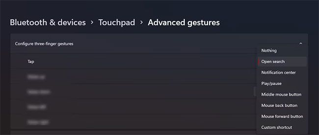 Bước 2: Trong cửa sổ Advanced gesture, bạn sẽ thấy danh sách các tùy chọn để điều chỉnh các cử chỉ ba ngón tay.