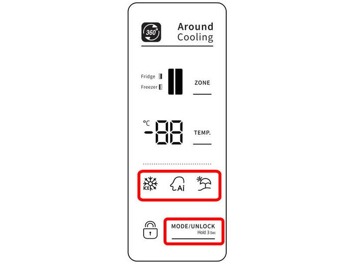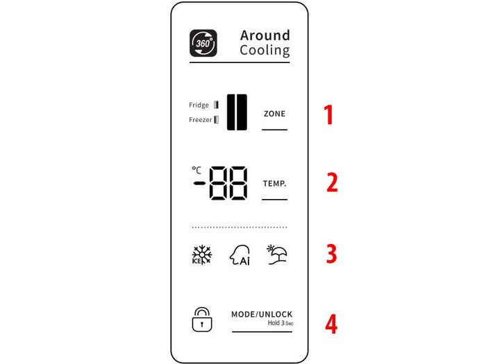 (1) : Sử dụng để lựa chọn ngăn bạn muốn điều chỉnh. 'Fridge' cho ngăn mát, 'Freezer' cho ngăn đông.