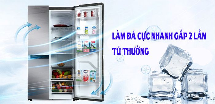 Chức năng làm đá cực nhanh là một trong những tính năng hiện đại được tích hợp trên tủ lạnh LG GR-B257JDS – Inverter, dung tích 649 lít. Ở chế độ này, ngăn đông của tủ sẽ hoạt động ở ngưỡng nhiệt độ thấp nhất giúp đóng đá và thực phẩm nhanh chóng. Tuy nhiên, lượng điện năng tiêu thụ cũng sẽ cao hơn so với chế độ thông thường.