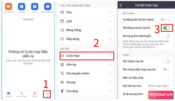 Bước 2: Chọn Cuộc họp > Tại mục Tắt tiếng micro của tôi, bạn di chuyển thanh trượt về bên phải để tắt mic trên ứng dụng Zoom. Ngược lại, nếu bạn muốn bật micro, hãy di chuyển thanh trượt về bên trái.
