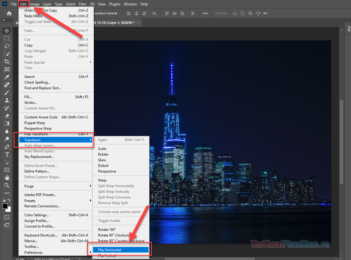 - Lật ngược Layer mới bằng cách chọn Chỉnh sửa >> Biến đổi >> Lật Ngang.
