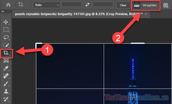 Chọn Công cụ Cắt ảnh bên trái, sau đó nhấn vào Chỉnh thẳng tại thanh menu ở phía trên.