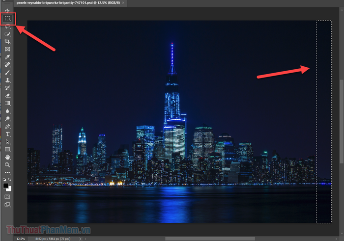 - Sử dụng Công cụ Lựa chọn Hình chữ nhật (M) để chọn một phần nhỏ ở cạnh bên phải của bức ảnh (vùng không có tòa nhà).
