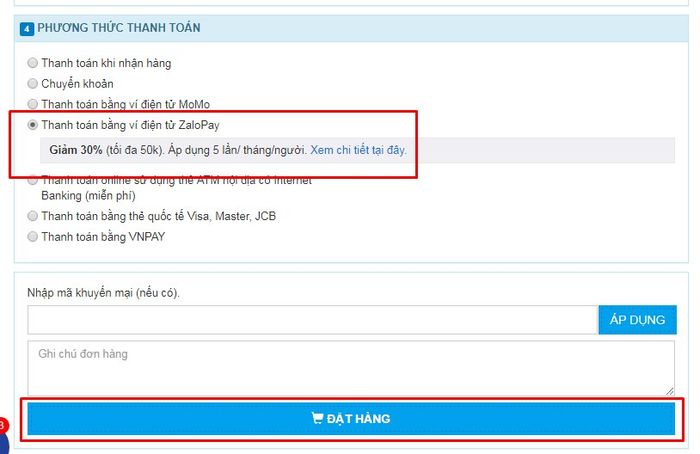 Bước 2: Nhập đầy đủ thông tin cần thiết bao gồm mã giảm giá, số điện thoại, tên người mua hàng và các yêu cầu khác. Tiếp theo, chọn Thanh toán bằng ZaloPay trong mục phương thức thanh toán.