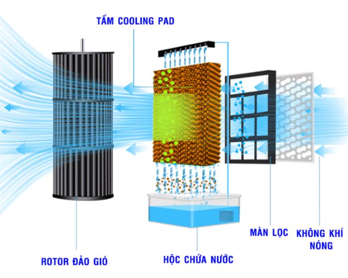- Tấm làm mát: Giảm nhiệt độ không khí qua việc hấp thụ hơi nước.