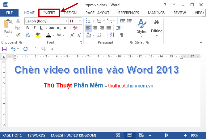 Bước 1: Mở file Word cần chèn video online, sau đó chọn thẻ Insert trên thanh Ribbon.