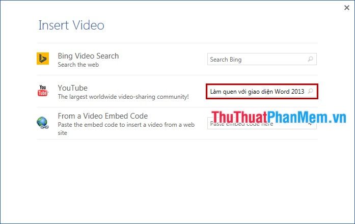 Nếu bạn sử dụng Bing Video Search hoặc Youtube, nhập tên video vào ô tìm kiếm để tìm và chèn vào Word. Đối với From a Video Embed Code, chỉ cần copy mã nhúng của video và dán vào ô Paste embed code here.