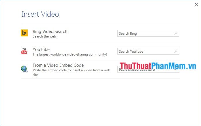 Bước 3: Trong hộp thoại Insert Video, bạn có 3 cách để chèn video online: Bing Video Search (video từ kết quả tìm kiếm Bing), Youtube, From a Video Embed Code (video từ một website bằng mã nhúng).