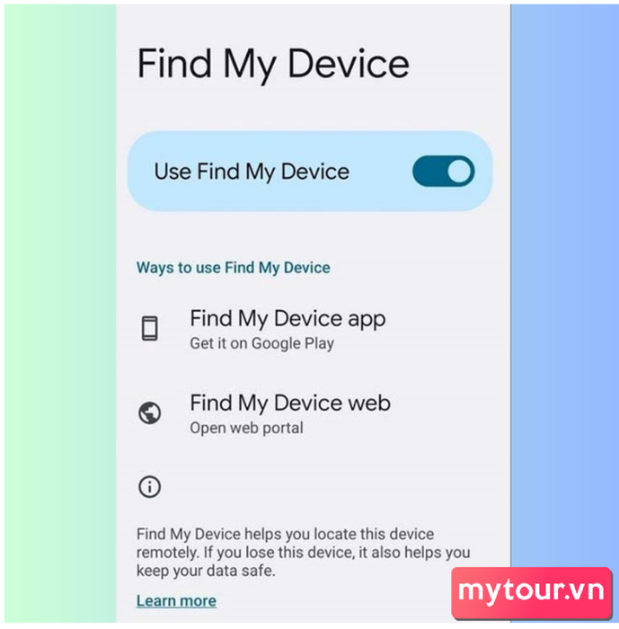 - Cách 1: Truy cập Cài đặt, chọn Bảo mật. Kích hoạt chức năng Tìm thiết bị của tôi bằng cách chuyển thanh trượt sang màu xanh lá.