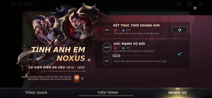 Sự kiện Tình Anh Em Noxus giới thiệu cặp đôi Darius và Draven - hai anh em này sẽ mở ra vũ trụ mới trong Tốc Chiến. Sự kiện diễn ra từ ngày 10/12 đến ngày 23/12. Nếu hoàn thành tất cả các sự kiện, bạn sẽ nhận được Draven hoặc Darius miễn phí. Tương tự như các sự kiện khác, bạn sẽ cần hoàn thành danh sách các nhiệm vụ, những nhiệm vụ này thường khó hoàn thành nhưng phần thưởng rất xịn.