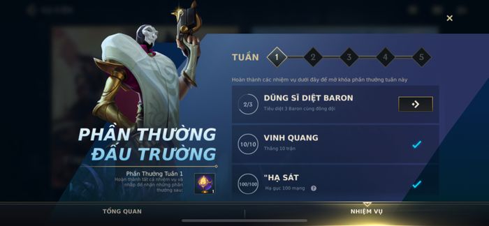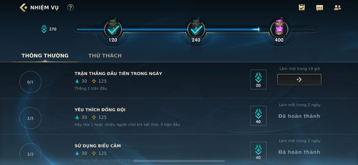 Đây là các nhiệm vụ mà bạn có thể hoàn thành khi chơi game bình thường. Không cần quá quan tâm, chỉ cần tiếp tục chơi và bạn sẽ hoàn thành tự động. Ví dụ như chiến thắng 10 trận, sử dụng biểu cảm, tiêu diệt quái vật, và nhiều nhiệm vụ khác.