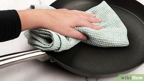 Làm khô chảo. Sau khi rửa sạch, lau khô chảo bằng khăn mềm. Quan trọng là chảo phải hoàn toàn khô trước khi tôi dầu, như vậy dầu mới có thể kết dính vào bề mặt chảo.