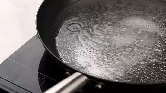 Đun trên lửa nhỏ cho đến khi hỗn hợp sôi. Đặt chảo chống dính lên bếp, vặn lửa nhỏ và đun khoảng 10 phút cho đến khi hỗn hợp giấm trong chảo sôi lên, sau đó nhấc chảo xuống.