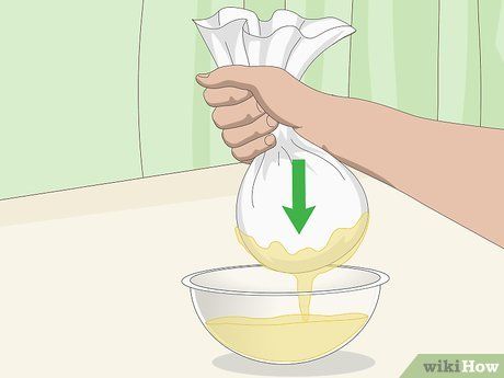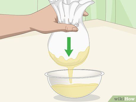 Vắt túi bơ vào bát. Nhấc mảnh vải chứa bơ lên và túm các góc lại như cái túi. Vắt bơ khô vào bát. Xoay vải để vắt hết bơ trong túi. Dừng khi không còn dầu chảy ra.