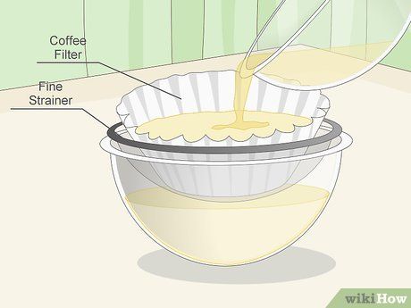 Để dầu tự lọc và đóng chai. Bạn có thể để rây lên trên miệng bát qua đêm. Như vậy, lượng dầu có thể còn dính trong các mẩu bơ sẽ từ từ được lọc vào bát. Sau khi lọc xong, hãy rót dầu bơ vào lọ nhỏ và đậy kín.