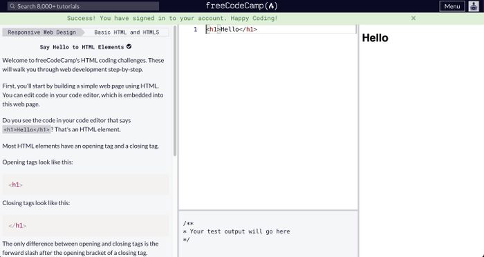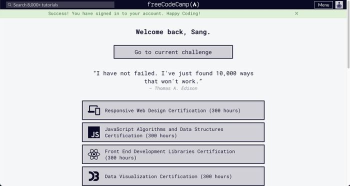 Đây là trang web freecodecamp.org, nơi cung cấp các khóa học lập trình miễn phí rất phổ biến. Mỗi ngày, bạn có thể dành một ít thời gian để học và thực hành theo hướng dẫn trên trang này.