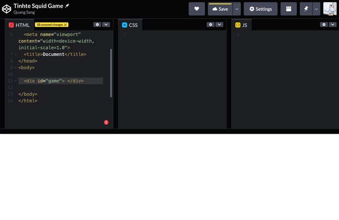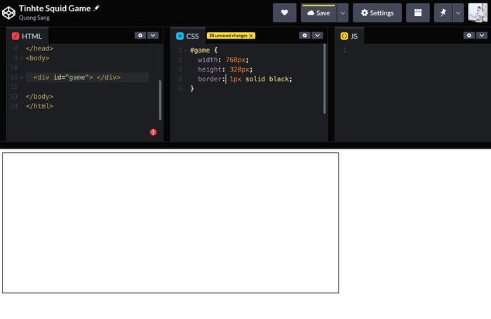 Viết mã trong cột CSS để định dạng các thẻ. Sử dụng dấu # để gọi id của thẻ, chỉ định width (chiều rộng), height (chiều cao) và border (viền). Phần trắng bên dưới sẽ hiện ra khung game. Viết code cũng đơn giản, chỉ vài dòng là xong ^^