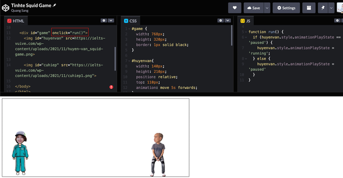 Bây giờ, mình sẽ thêm một hàm vào JS có tên là run với ý nghĩa như sau: nếu style của huyenvan đang là paused, thì chuyển thành running; ngược lại, chuyển thành paused. (Lưu ý: ‘=’ là gán giá trị, còn ‘==’ là so sánh giá trị).
