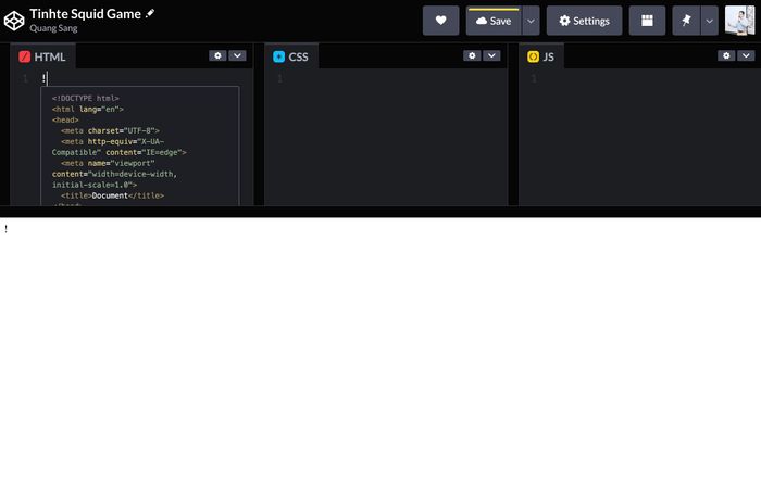 Giao diện sẽ có 3 cột là HTML, CSS và JS (Javascript). Để bắt đầu viết mã HTML, hãy gõ ! và nhấn TAB, bạn sẽ có phần HTML cơ bản cho trang web.