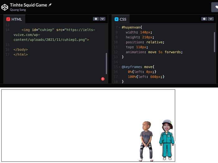 Thêm phần KeyFrame để tạo hiệu ứng chuyển động (0% là điểm bắt đầu, 100% là điểm kết thúc). Sau đó, thêm vào phần tử huyenvan thuộc tính animation: (tên keyframe) + (thời gian chạy của Huyền Vân) + forwards (khi chạy đến cuối thì dừng lại, không quay trở lại 0%).