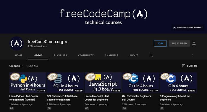 Nếu bạn muốn học qua video, bạn cũng có thể xem trên kênh YouTube của họ: freeCodeCamp.org - YouTube