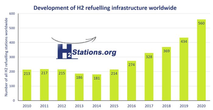 The growth of hydrogen refueling globally — H2stations.org by LBST.Các phương tiện chạy bằng tế bào nhiên liệu hydro chia sẻ nỗi đau mà người dùng xe điện cũng gặp phải — cả hai đều thiếu quy cách tiếp cận dễ dàng đến trạm nạp hoặc nguồn điện. Vào cuối năm 2020, có 553 trạm nạp hydro đang hoạt động trên toàn cầu.