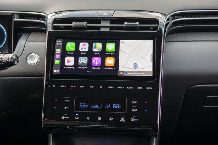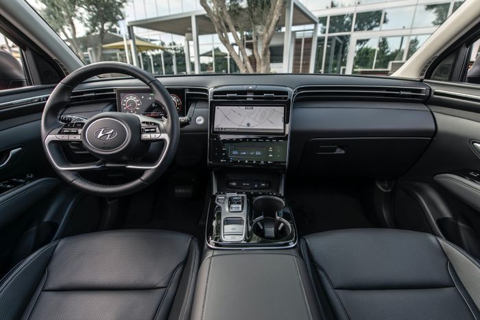 Quá trình cải tiến của Hyundai Tucson 2022 cũng được thực hiện bên trong cabin xe. Bảng điều khiển trung tâm giờ đây đã được thiết kế phẳng hơn, đổ dài theo chiều dọc từ táp-lô xuống khu vực hộc chứa đồ trung tâm. Những đường viền kim loại từ bảng điều khiển trung tâm lên trên táp-lô và kéo dài sang 2 bên, tạo cảm giác rộng rãi cho hành khách ở hàng ghế đầu. Trong cabin xe còn có hệ thống thông tin giải trí với màn hình cảm ứng lớn 10.25 inch cùng cụm đồng hồ kỹ thuật số dạng mới.