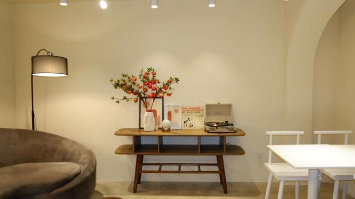 Large windows welcome sunlight, elegant green plants, artistic paintings on the walls, modern furniture, and a charming green garden, the rooftop twinkling with flower lights at night. By the large windows, you can choose a seat facing An Duong Vuong street, or the neatly arranged tables on the second floor - each corner here is associated with unique experiences.